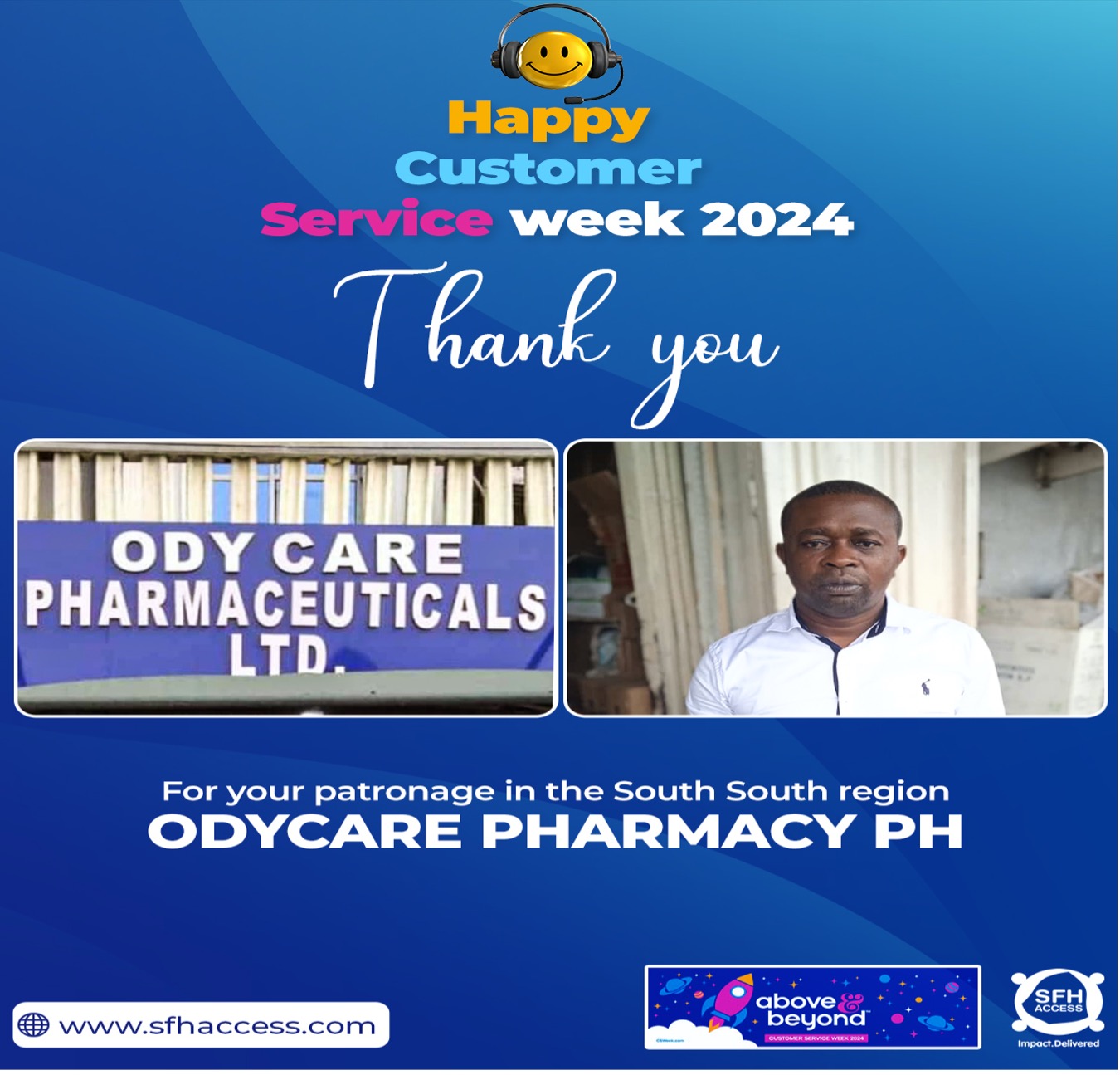 It is with great pride that we recognize Odycare Pharmaceuticals LTD for their outstanding contributions to the healthcare sector. Your commitment to providing high-quality healthcare solutions exemplifies the mission of SFH Access. The dedication you bring to ensuring healthcare quality and accessibility serves as an inspiration, and your partnership is a key element in our shared success. We look forward to building on our accomplishments and working together to address the growing healthcare needs of the South-South region.
